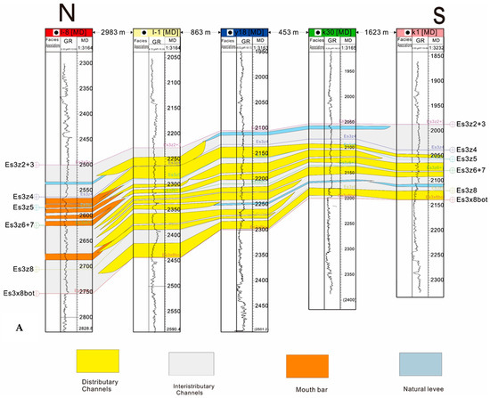 Based on our results of depositional facies and lithological analysis, cross sections trending S-N and E-W have been constructed. It shows the distribution of facies with sandstone groups at lateral and vertical directions in the reservoir zone (Figure 14). The types and spatial distribution of distributary channels and other facies associations are also recognized in non-cored wells with the help of electro-facies of logs. From stratigraphic analysis, five sandstone groups were correlated and separated by mudstones (described in methodology part). Overall, it shows a fining upward trend in lateral and vertical directions bounded by sequence boundaries at the south (Figure 14). The direction of sedimentation is towards the north, and the upper Es3z2+3 sand group contains thick mudstone layers, while other sandstone bodies are predominantly composed of thick distributary channels (each up to 20 m) that are prograding towards the basin side (Figure 14 and Figure 15). These deposits have good lateral continuity, up to an average 2900 m in cross section profile. Sandstones, siltstone and mudstones show a longitudinal geometry in different facies associations. It shows a variation in alternate layers of distributary and interdistributary channels with natural levee in upper and lower sandstone bodies (Figure 14). Facies associations of mouth bar contain an average thickness of 60 m in the middle intervals of Es3z4, Es3z5 and Es3z6+7 sand groups at the basin side. The average thickness of all sandstone groups is up to 150 m on the southern side, which varies up to 250 m towards the north.