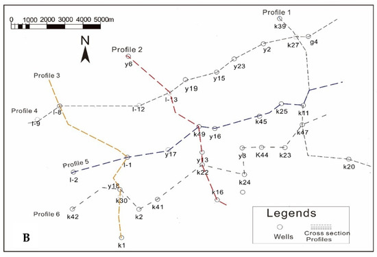 (A) Cross section profile 3 of facies associations in five sandstones group, showing facies to facies correlations from south to north. (B) Cross section of all profiles.