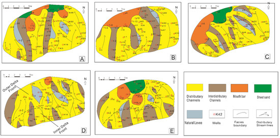 In total, five facies maps have been constructed, based on analysis of well logs, seismic and core data, which depicts a complete depositional history of facies associations in targeted sandstone group. Facies association of belt distributary channels are sourced from south-east towards north and north-west, representing a wide area along with inter-distributary channels, natural levee, sheet sand and mouth bar deposits (Figure 16A). Lithology of natural levees are associated with distributary channels and their intermediate areas. Mouth bar has well sorted sandstones at the terminal side of the distributary channels, followed by sheet sand, ranging in thickness from 0.5 to 1 m [35] (Figure 8 and Figure 17). The terminal side of the distributary channels show aqueous or sub-aqueous extension and represents a transitional area where the river from the delta front flows into a shallow to deep lake [41] and deposits a fine-grained sandstone (Figure 8). During the flooding periods, this area is under the influence of high-driven flow processes [32]. Mouth bars or mudstones are scoured by terminal distributary channels, both in shallow and deep lakes (Figure 16A).