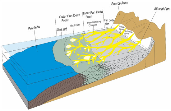 The outer delta front is characterized by facies associations of distributary channels, mouth bar, levees and sheet sandstone. Typically, the mouth bar deposit contains sandy and coarsening upward successions. Mudstones in interdistributary channels have greenish gray or darker color, and distributary channels are less blocky as compared to the channel deposits of the outer delta front (Figure 5B,C and Figure 8). The overall deposition of sand in the delta front is controlled by a lake or river [27], and these factors have an influence on the depositional setting in our study area. We found lacustrine mudstone in the outer delta front deposits, which is characterized by facies associations of inter-distributary channel deposits, and we can distinguish it on the basis of the color being dark gray calcareous mudstone (Figure 5C).