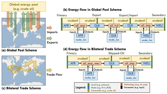 Schematics of the MESSAGEix global energy model. (a) Illustration of the “global pool schema” representation of international trade. There are 14 representative regions. Each region can export to (green) or import from (red) a global pool of each energy commodity (e.g., crude oil). (b) Energy flow in the global schema through inputs and output. Model “levels” are in green (e.g., primary, secondary, export, final), nodes are in blue (i.e., regions), commodities are in yellow (e.g., coal, crude oil), technologies are in orange (e.g., exports, imports), and parameters are in black (e.g., input, output). AFR represents Africa, GLB represents the global node, and WEU represents Western Europe. This flow therefore represents crude oil exports from Africa to Western Europe. (c) Illustration of the “bilateral trade schema” for international trade. We explicitly model bilateral trade flows for each energy commodity, thus representing trade as a network rather than a pooled resource. (d) Flow of energy in bilateral representation of trade. Note here that technologies now explicitly define the destination of, in this instance, crude oil exports. Commodities also explicitly denote the destination (“crudeoil_weu”).
