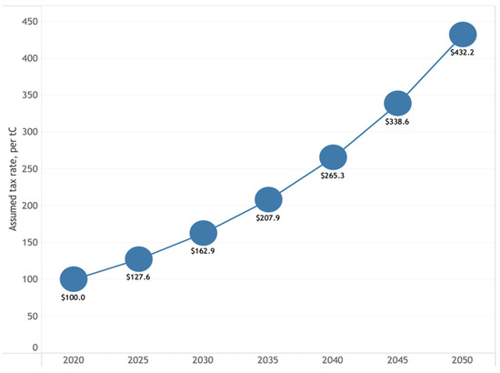 We build the emissions tax scenario by setting the tax to the equivalent of $27/tCO2 (or $100/tC), increasing by 5% annually. This annual increase has been used in other studies on carbon pricing [45]. Figure 2 displays the emissions tax at each stage of the model horizon.