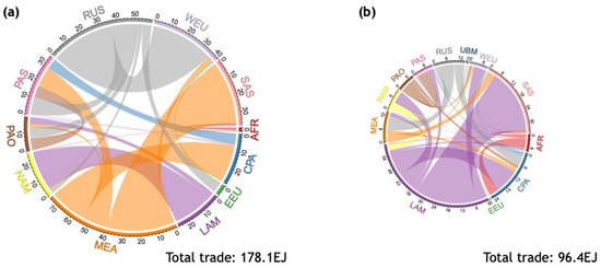 The energy trade network in 2050 under the baseline scenario (a) and under an emissions tax scenario (b). This figure illustrates the network across energy commodities, (i.e., it is the sum of coal, crude oil, ethanol, fuel oil, light oil, LNG, methanol, and liquid hydrogen). Each chord represents the net export flow. The units of these chord diagrams are in EJ. Regions are represented as follows: AFR = Africa, CPA = Centrally Planned Asia, EEU = Eastern Europe, LAM = Latin America, MEA = Middle East and North Africa, NAM = North America, PAO = Pacific OECD, PAS = Pacific Asia, RUS = Russia, SAS = South Asia, WEU = Western Europe. The color of the traded volume is identical to the exporter region.