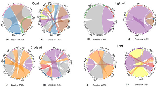 Trade networks in 2050 under the baseline scenario (left column) and emissions tax scenario (right column). (a,b) represent coal trade, (c,d) represent crude oil trade, (e,f) represent light oil trade, (g,h) represent LNG trade. Total trade for the given energy commodity is given in the corresponding box in EJ.