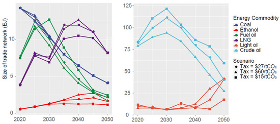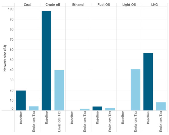 Total global trade size by energy commodity in 2050 in baseline and emissions tax scenarios.