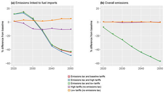Changes from the baseline scenario for the global level. The figure is in terms of emissions associated with fuel imports (a) and overall (b). Each line is colored by a different scenario.