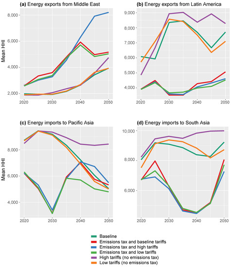 We measure energy security using the HHI introduced in the Materials and Methods section of this paper. Figure 7a,b illustrate the trajectories of exporter HHI for the two largest energy exporters (Middle East and Latin America). Figure 7c,d illustrate the trajectories of the importer HHI for the two largest energy importers in the baseline scenario (Pacific Asia and South Asia). Each color represents a different scenario. These results indicate that neither low tariff nor high tariff scenarios influence the general magnitude or direction of both export diversity and import diversity. This is with the exception of the high tariff scenario in Pacific Asia, which exhibits reduced portfolio diversity over time when higher tariffs are levied. In general, the emissions tax scenarios allow regions to maintain a more diverse portfolio of importers. In Pacific Asia and in South Asia, we observe a dramatic decrease in HHI (i.e., higher portfolio diversity) in the short term. For Pacific Asia, this reflects a shift away from crude oil and toward light oil from Latin America and Oceania. For South Asia, this reflects a shift away from LNG from the Middle East and toward light oil from these same regions. In other words, dependence on one commodity is split into two or more commodities from two or more regions. This is consistent with the effects of the emissions tax on the global fuel trade network, as increased complexity in the network is facilitated when each region has more trade linkages and balances its imports and/or exports among these linkages. Interestingly this effect does not translate generally to energy exporters; while the emissions tax allows for increased diversity in energy exports from Latin America, it reduces diversity in energy exports from Middle East. This is in fact a function of the dramatic reduction in crude oil demand from importing regions under the emissions tax scenario.