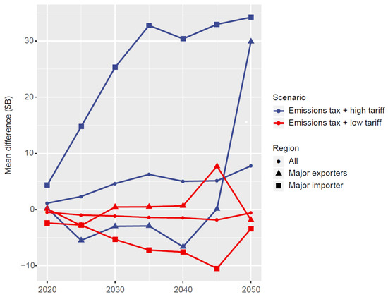 We validate this argument by illustrating the difference in regional energy system costs (compared to the baseline) when tariff policies are applied or removed after a carbon emissions tax is applied. We illustrate these marginal differences for major energy-exporting regions (Latin America, Middle East, and Russia), major energy-importing regions (Pacific Asia, South Asia, and Centrally Planned Asia), and across all regions.