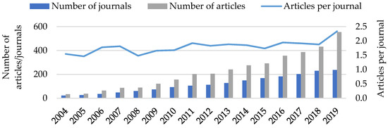 The right axis of Figure 1 shows the average number of articles per journal, which increased in the last year (2019), when it reached almost 2.5. In 2004 the average number of articles per journal was slightly over 1.5 and in 2011–2018 it remained under 2 articles per journal. Thus, although the average number of articles per journal stayed very similar for most of the period, in 2019 we can observe an increase in the discussion in the journals as more articles were published on the CEE energy sector.