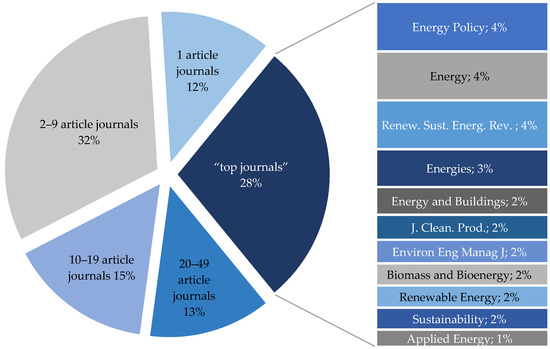 In the first step, we created a dataset containing all the papers that met our criteria. Contrary to similar research, we did not look at just one journal [51] or select journals ([52] usually referred to as the “leading” or “main” journals) but opted to collect all articles relating to the region. We searched the Web of Knowledge (WoK) database with the help of two sets of keywords and did not focus on particular journals or disciplines. This approach allowed us to focus on the energy sector more broadly, to collect all the research papers, and to go beyond the more traditional (and much less time-consuming) approach of choosing a limited number of journals for coding. Altogether, we collected articles that were published in (exactly) 800 different journals (see Figure 1). We used the WoK database as our source of articles, an approach commonly utilized by scholars examining existing research [32] (see [27] for an example of the use of different databases or [53] for combining WoK and other databases).