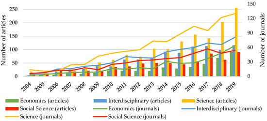 In the period studied (2004–2019) 3534 scholarly articles from various disciplines were published in (precisely) 800 academic journals listed in WoK. The large variety of journals in our dataset indicates that a wide range of journals, not just those focusing on energy related issues, are interested in research on the CEE energy sector. For example, the Journal Citation Report lists 144 journals in the Energy and Fuels category, 274 in Environmental Sciences, and 377 in Economics. Moreover, the number of journals (and articles) publishing research on energy in the CEE region has risen (Figure 1, left axis).