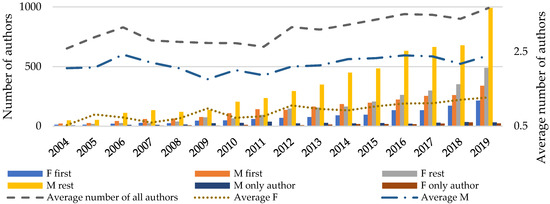 We then looked at the authors of papers published on CEE energy between 2004 and 2019 from two main perspectives: gender and collaboration. Figure 4 shows the number of male and female authors (left axis) compared to the average number of authors per article (right axis). Some authors occur in the data multiple times. Altogether we identified 3658 female authors (almost 32% of all authors) and 7886 male authors (slightly over 68%). Male authors dominated our dataset each year, both as first authors and as authors in general. The lowest share of female authors occurred in 2004 (above 20%) and the highest in 2018 (almost 36%). Overall, a male researcher was the first author of 2300 articles (more than 65%) and women were the first authors of 1234 (almost 35%). There were 431 articles (about 12%) by female authors; of these, 189 were written by a single author and 242 in collaboration with other female authors. Papers authored by men amounted to 1405 articles (almost 40%); of these, only 348 were written by a single author and the remaining 1057 were collaborative efforts with other male authors.