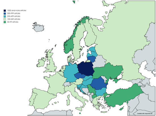 Number of articles (above 50) examining select countries. Source: Authors; N = 3534; made with Mapchart.net (accessed on 20 July 2022).