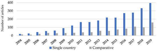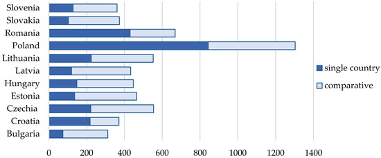 Within the CEE region Poland was the most commonly studied country, with 1303 articles researching energy issues in Poland between 2004 and 2019. There was a significant increase in interest in Poland—from 14 articles in 2004 to 262 in 2019 (see Figure 7). No other country received as much academic attention. Romania was ranked second and was the country of interest in 668 articles, followed by the Czech Republic on 554, and Lithuania on 552. Bulgaria was ranked last, with 312 papers covering this country. However, Bulgaria often featured in comparative studies—76% of the papers (238 out of 312) on Bulgaria looked at a minimum of one other country (see Figure 8). This may be indicative of a lack of expertise on Bulgaria and its distinctiveness within the CEE region. By contrast, only 35% of articles examined Poland and Romania with a comparative research design.