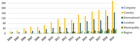 The current section is concerned with the content of the articles in our dataset. Figure 9 provides information on the level of governance and shows that most of the articles adopt a whole-country perspective when considering energy issues. The number of articles is broken down by six categories of level of governance (location, company, municipality, region, country, and international). The greatest increase in the number of articles was seen at the country level (up from 16 in 2004 to 257 in 2019), followed by papers on a single location; for example, energy efficiency experiments on a single building or biomass cultivation in a specific field (from 12 to 166). It is interesting that the number of company-level and municipality-level analyses remained very low—the highest number of articles researching a company was 27 in 2019 and for municipalities the highest number was 36 articles in 2018. Further research on both these levels is required, as cities and companies will be a crucial aspect of energy efficiency measures as part of climate change mitigation.