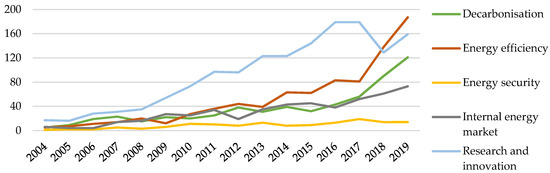 We then looked at the Energy Union dimensions (Figure 10). The European Commission’s Energy Union initiative proposed five main categories for EU energy policy—decarbonization, energy efficiency, energy security, internal energy market, and research and innovation [59]. We coded our dataset accordingly to find out which categories have been researched most and which require further analysis. We can observe a clear trend in the rise of papers on decarbonization and energy efficiency, especially since 2017. In 2004, only five papers were published in each of the two categories and, in 2017, this rose to 56 and 81 respectively; by 2019 there were 121 articles on decarbonization and 187 on energy efficiency in CEE countries. The trend in research and innovation is less clear-cut, with 2018 seeing a rather sharp decrease, despite it having previously dominated the research. Research on the internal energy market recorded some increase, but this was only minimal. The least-covered area was energy security, despite this having changed considerably in the CEE region after the 2009 gas crisis [44]. Some increase was recorded in the years following the 2009 crisis and the 2014 dispute between the Russian Federation and Ukraine, but overall interest remained low, peaking in 2017 with 19 articles.