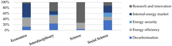 We then looked more closely at the relation between the five Energy Union dimensions and the various scholarly disciplines (Figure 11). Economic papers tended to focus on the internal energy market (213 articles) and energy efficiency (137 articles); interdisciplinary research was mostly concerned with research and innovation (310) and energy efficiency (279); and decarbonization research was ranked third (236 articles). Science was clearly dominated by research and innovation (1073 articles). There were no articles coded under energy security or the internal market dimension. The social sciences focused mostly on decarbonization (233 articles) and the internal energy market (162 articles), in addition to the other three Energy Union dimensions. The social sciences–unlike all the other disciplines–also paid attention to the energy security of the CEE region (97 articles).