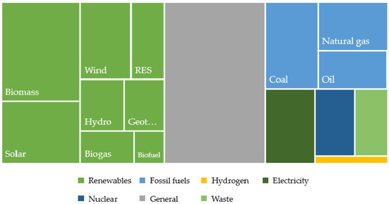 Finally, looking at the type of source in the articles, research on renewable energy sources (RESs) dominated, with 1803 articles or 51% of all the research in our database (Figure 12). Within this category, most research was on biomass (542 articles), solar energy (337 articles), wind energy (269 articles), hydro energy (154 articles), geothermal (140 articles), biogas (119 articles), and biofuel (67 articles). RESs in general (with no indication of RES type) featured in 175 articles. The second-largest category was general energy sources (no particular energy source was mentioned in these articles) and was covered primarily in articles analyzing the energy efficiency of buildings. Fossil fuels were discussed in 734 articles, especially coal (315 articles), then natural gas (234 articles) and oil (182 articles). Three articles dealt with fossil fuels in general. The number of articles on natural gas was very small given that the region experienced two gas crises in 2006 and 2009 (and at least one other tense period between the Russian Federation and Ukraine, the main actors in the two crises). Research on electricity was covered in 252 articles, nuclear in 184 articles, and waste in 153 articles, whereas the research on hydrogen is in a nascent phase, having 37 articles. This is despite the first paper on hydrogen in the CEE region being published in 2006 [62].