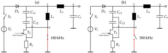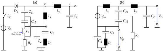 An advantage in dealing with interconnected LC resonant circuits is the fact that at the resonant/anti-resonant frequency of a subsystem, those sub-circuits can be ideally either replaced with a virtual open connection or a virtual short circuit. Since our transmitter needs to deal only with two frequencies, sub-circuits with those two resonant or anti-resonant frequencies can be replaced with one of the named two options. Because of this, the presented two pole filter can be connected to our circuit without any kind of impedance transformer. In the following, Figure 4 shows the equivalent circuit of the two cases where the used filter is replaced with either a short circuit or an open connection. This simplified circuit is valid for ideal components; using real components, the equivalent resistance of the virtual switch in both situations depends on the quality factor of the components. For the simulation presented in Section 4.1, the capacitors are modeled as ideal capacitors and the inductance is modeled, including a series resistance of . For our prototype presented in Section 4.2, the used inductance is chosen regarding a low series resistance, in order to be as close as possible to the ideal case.
