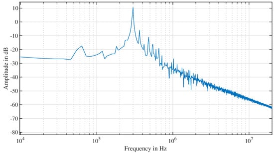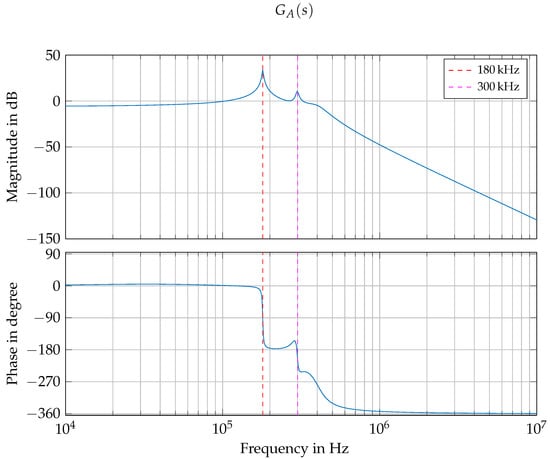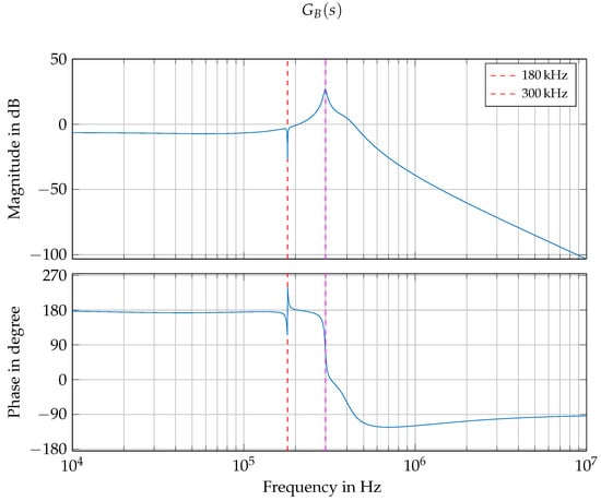 In order to calculate the frequency responses, the transfer functions for the two output voltages need to be calculated. Therefore, the mesh current method is used to define the equation system for the circuit. This is solved using Matlab by MathWorks (2020b, MathWorks, Natick, MA, USA). The voltage source in series to the inductance is therefore used as input voltage. The transfer function for the output voltage is a rational fraction with a seventh-order polynomial in the denominator. Its Bode plot is shown in Figure 6. The main resonance at the frequency of 180 kHz is clearly recognizable. It is clear that the WPT receive circuit with the transfer function has a second resonance at 300 kHz. This second resonance is caused due to the existing connection to the capacitors and . It is therefore important to emphasize that this second resonance is clearly damped by the resistor (which is the resistor at the source pin of the JFET transistor of the Colpitts oscillator amplifier circuit) and is therefore not relevant for the functionality of the energy receive circuit.