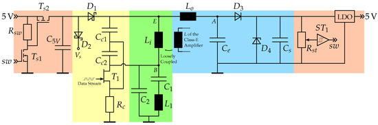In order to implement the energy storage sub-circuit, the alternating voltage at node A (see therefore, Figure 5) needs to be rectified for charging the capacitor that is used to temporarily store the energy. A half-wave rectification is used for this aim. According to [], this type of rectification is suitable for a voltage input and generates a voltage output. It would not be applicable for a current input, as would be the case if a series resonant oscillator were used as a WPT receive circuit. The negative half-wave of the common current through the whole series connection would be cut off.