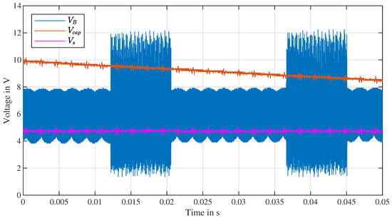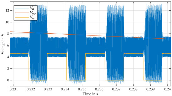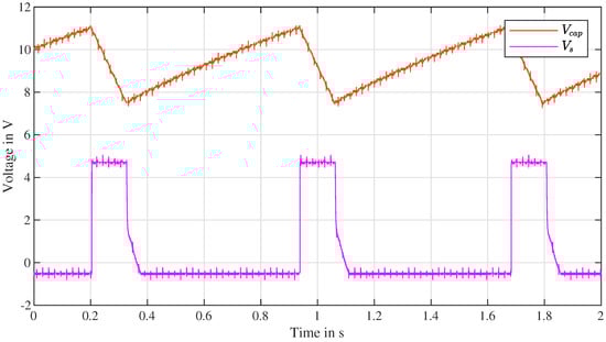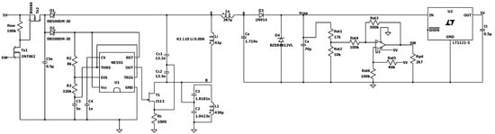 Figure 8 shows the circuit from Figure 5a expanded by the solid state switch (, and ) and the sub-circuit used to store the energy in the capacitor . The Schmitt trigger depicted in Figure 8 as one building block is realized in practice as an operational amplifier-based, non-inverting Schmitt trigger. The resistor in its feedback loop and the one at the positive input of the operational amplifier are summarized using a potentiometer. Additionally, the reference voltage at the negative input of the used operational amplifier is generated from the 5 V LDO output voltage via an adjustable voltage divider. This enables a complete adjustment of the switching thresholds of the Schmitt trigger. As an operational amplifier, a rail-to-rail model is used.