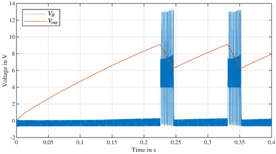 Simulated voltages across the capacitor () and at node B () from the transmitter circuit in Figure 9.