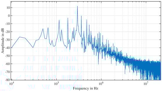 The transmitter is realized on a circuit board. We use a digital temperature sensor that encodes the temperature value as a pulse width coded signal. Since we use the on-off keying, the pulse width coded output signal can be used to switch the Colpitts oscillator. The oscillator behaves inversely to the switching levels of the input signal: for a low level at its JFET transistor gate the oscillator is switched on and vice versa. Therefore, the output signal of the sensor is inverted, and additionally, its low level can be adjusted in order to optimize the amplification of the Colpitts oscillator. This is performed in order to maximize its output amplitudes. The circuit is realized based on the values shown in Figure 9. The energy storing capacitor on our prototype has a much bigger value (820 F) compared to the one used in the simulation, where a lower capacity value was used in order to reduce its charging time, and so, the simulation time. The transistors and and the diodes were replaced with components with similar characteristics on the prototype. Instead of the square wave generator, a real temperature sensor is used, as described above. As for the inductive power supply, a 150 W class-E amplifier, which was developed for the inductively powered wireless internal illumination of photoreactors, is used. Its resonant frequency is 180 kHz. Crucial and important signals measured on our prototype are shown in Figure 13 and Figure 14. The voltage across the capacitor is depicted in orange. Clearly recognizable in Figure 13 are the switching limits set by the Schmitt trigger, where the high switching limit is set to approx. 11 V and the low level at approx. V. The signal depicted in magenta is the signal which in Figure 8 is named as which is basically the supply voltage for the sensor. As with the simulation, we also calculated the mean power values for the two operating steps for our prototype. The mean power consumption during the data transmitting step results in approx. , and the mean power harvested from the magnetic field during the energy receiving step results in approx. . Figure 14 shows the on-off coded data bits of the temperature sensor. We performed the fast Fourier transformation of the signal at node B during 200 s of the on state of the Colpitts oscillator in order to prove the transmitting frequency. Figure 15 shows its result. The main frequency is clearly the resonance frequency at approx. 300 kHz. Using real components can influence the behavior of a circuit when compared to a simulation result. This is clearly recognizable in Figure 15. The frequency of the inductive power transmission is not completely filtered out in using the two pole filter from the Section 3 build with real components. The Fourier transformation reveals peaks at the power supply frequency of 180 kHz and at its first harmonic (360 kHz). Since the amplitudes of those peaks are more than 12 dB lower compared to the main oscillation frequency, it is not a big deal for our purpose.