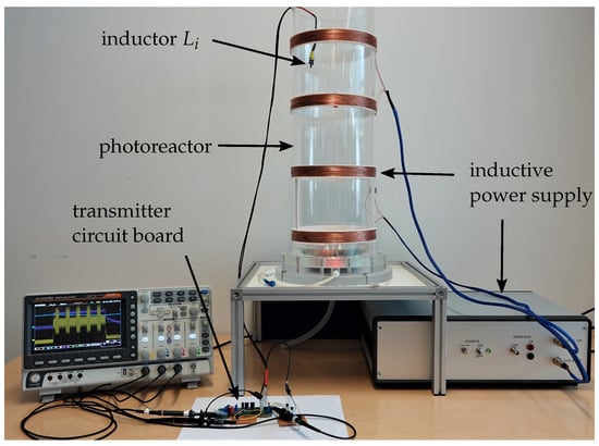 Since our prototype is not miniaturized, its functionality was tested with only the WPT/data transmitting coil placed in the magnetic field inside the reactor. Therefore, the named coil was connected with cables to the circuit board of our transmitter prototype, which was placed outside the reactor. This allowed us a better handling during the debugging phase of building up this first prototype, since all signal measurements on the circuit board could be performed outside the photoreactor. The setup can be seen in Figure 16. On the left side in Figure 16, the oscilloscope with the measured signals can be seen. In yellow, the on-off coded data bits at the Colpitts oscillator (node B) are clearly recognizable. This signal corresponds to the voltage plotted in Figure 14. At the outer diameter of the photoreactor, the four coils of the inductive power supply can be seen.