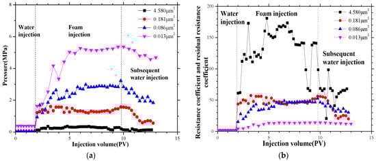 Foam seepage pressure difference, resistance coefficient, and residual resistance coefficient under different permeability rates. (Note: (a) shows the variation of foam pressure difference at different permeability. (b) shows the change of resistance coefficient and residual resistance coefficient at different permeability.).