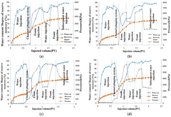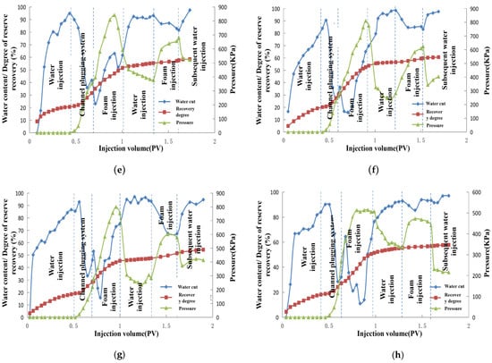 Comparing “b” and “d”, the permeability of high and low permeability layers in the core are the same except for the middle permeability layer, and the degree of water drive recovery is also the same. Since the channel plugging system shows better adaptability to the high permeability layer, the foam drive stage mainly flows through the middle and low permeability layers. Since the differential between middle and low permeability formations in “b” is equal to 10, and the grade difference between middle and low permeability formations in “d” is equal to 5, the degree of foam drive recovery and the final recovery rate in “d” are higher than those in “b”, which indicates that the near homogeneous formation is favorable for foam drive [21].