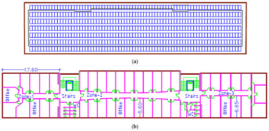 A plan view of the rooftop PV panels (546 panels in total, with minimal shading effects) is shown in Figure 1. Climatic data are introduced by means of a typical meteorological year (TMY) for the city of Volos. This includes the hourly input values of ambient temperature (DB), relative humidity, wind direction/speed, and the total/direct solar horizontal radiation for the full year (8760 h).