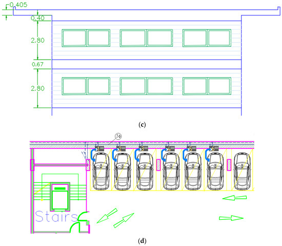 Layout drawing of the house that was employed in the simulations: (a) Plan of a typical floor level, (b) plan of rooftop PV installation, (c) eastward view of the third and fourth levels, and (d) part of the EV car parking places with chargers # 1 to 6 at the building’s basement. Dimensions in meters (m).