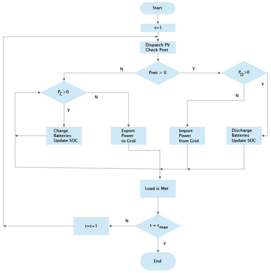 where is the required load (kW), is the PV system’s generation (kW), is the PV inverter’s efficiency (%), and is the DC power that is generated by the PV array (kW). The value of the net required load can be zero, negative, or positive. Zero value indicates that the required load is satisfied precisely by the PV array. A negative value means excess power that is produced by the PV system, which can be employed to charge the battery if the battery Soc is <1. Otherwise, the excess power is exported to the network. On the other hand, a positive value would imply that there exists an additional load to be met, either by discharging the battery, if Soc > 0.3 and batteries are connected, or by electricity import from the external network.