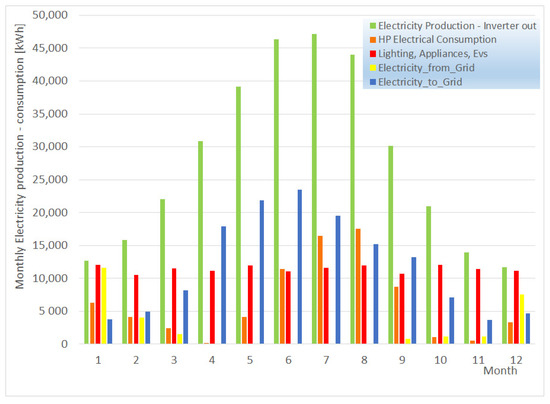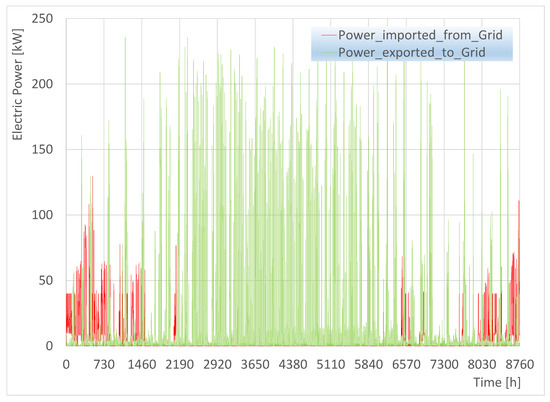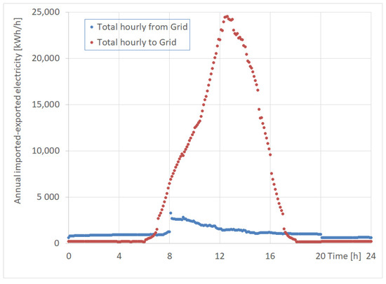 A different view of the electricity exchange of the building with the external grid can be seen in Figure 17, where the total annual electricity flow from grid and the respective export to the grid from the building are plotted as function of the hour of day. According to this diagram, electricity imports from the grid of a significant value occur only during the morning hours 08:00–10:00 am during winter, as already presented in Figure 3. On the other hand, the bulk of electricity exports to the grid, which are an order of magnitude higher, takes place between hours 07:00 and 17:00. The maximum exported electricity occurs between 12:00 and 14:00.
