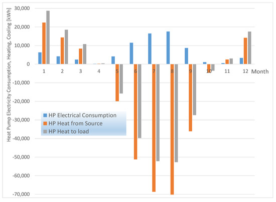 Monthly summaries of heat pump electricity consumption, heat from source, and heat to load. Cooling mode prevails during the months of May to October, as seen by the negative (cooling) kWh.