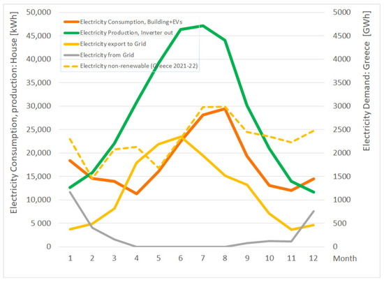 Monthly variation of PV electricity production, electricity consumption of the office building, and charging requirements for the 40 employees’ electric cars, compared to the trend in the non-renewable monthly electricity consumption of Greece during 2021–22.