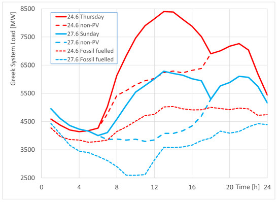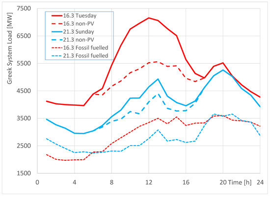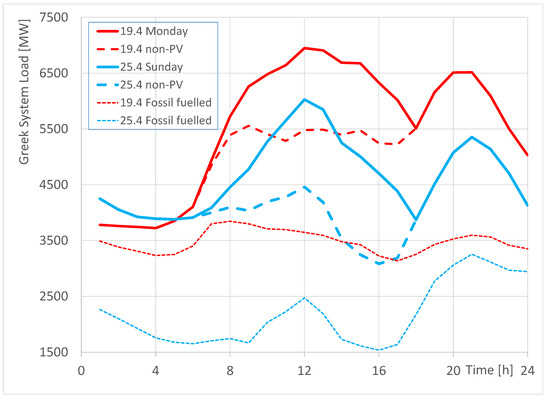 Greek system electricity load curve during a week-day and a weekend day (Sunday) with normal ambient temperatures and clear skies, in April 2021. For comparison, the load that is covered without the PV contribution, and the fossil-fuelled load are shown [42].