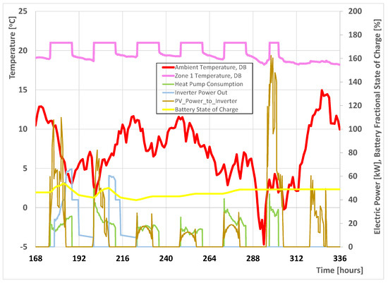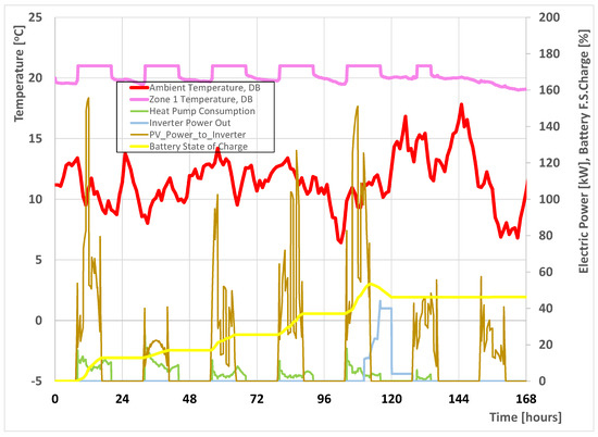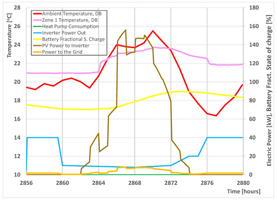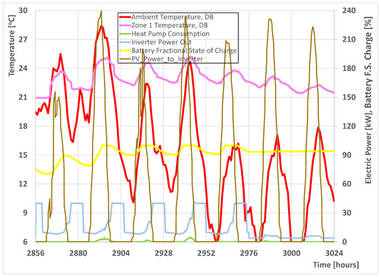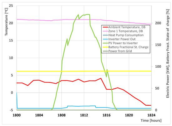 A more detailed study of the transient system’s behavior can be done in the example of Figure 9, which concerns a cold, sunny day of March. This day is selected to correspond to the typology of Figure 6. The battery state of charge is starting higher than 98% FSC. The battery is charging slowly to 99% during the day by the surplus electricity that is provided by the PV panels, which exceeds the heat pump, lighting, and electrical appliances consumption.