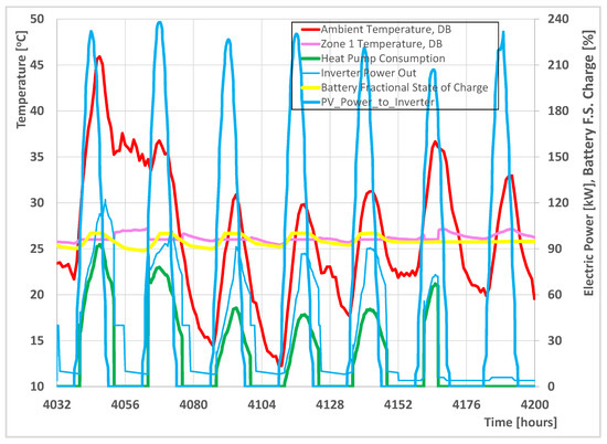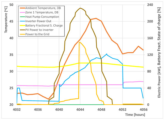 Starting from 4042 h, high ambient temperatures are seen to significantly increase the operation and electricity consumption of the heat pump during the hot hours. The ground-source heat pump is very efficient in cooling operation because of the significant heat capacity of the ground boreholes. The battery aggregate constantly keeps a high state of charge levels, in the range 90–100% FSC. These levels are supported by the high production levels of the rooftop PV installation, which outperforms the house’s loads and electric cars’ demand. After 4080 h, the ambient temperature levels are reduced, the heat pump’s consumption drops, and the battery charging levels stabilize even higher (95–100% FSC). The batteries stay fully charged during the noon hours, the house becomes again a net electricity producer and exports high levels of electric power to the grid. This is presented in Figure 15, which concerns the first day (Monday) of the specific week, which has the highest ambient temperature levels, exceeding 45 °C. The variation of power levels that are exported to the grid, peaking at 150 kW at 12:00 h and continuing at high levels until 15:00, is shown superimposed. The transient behavior of the batteries FSC may be clearly correlated to the PV production and the load profiles of the house, EVs and the heat pump. As usual, the main battery charging task is shifted to the morning hours, where plenty of PV electricity is available during the sunny days.
