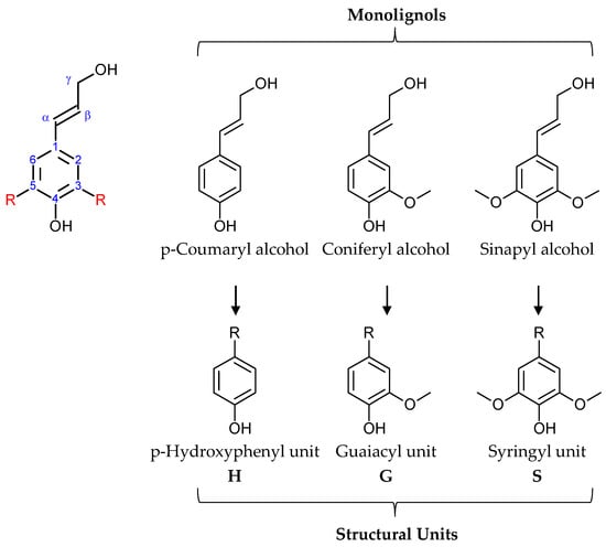 A portion of lignin heterogeneity originates in its structure, composed mainly of three monolignols. These derivates of cinnamyl alcohol are p-coumaryl alcohol, coniferyl alcohol, and sinapyl alcohol, as observed in Figure 1. Different plant species have lignin with different ratios of monolignols. It is worth mentioning that monolignols transfer to the corresponding structural units during biosynthesis [4,26].