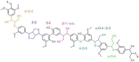 Softwood or coniferous plants have a higher content of coniferyl alcohol, whereas hardwood or deciduous plants contain both coniferyl and sinapyl alcohol [25]. Grasses and grass-like plants tend to have all three monomers more equally represented [27]. The structure or bonding of these monomers is also different, based on plant species, where specific distinctions can be observed [4,26]. Softwood trees usually have more carbon–carbon bonds than hardwood trees [25,28]. These diversities make it impossible to determine the uniform structure of lignin. However, trends for specific plants can be observed, like the previously mentioned monolignol or linking ratios [25,27,29].