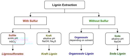 For further understanding, a simplified separation of currently used industrial lignin extraction methods are observable, with their respective lignin products, in Figure 3.