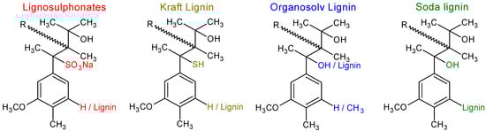 The problematic factor for the industrial utilisation of lignin obtained from currently utilised industrial plants and the delignification process is the changes in the structure of lignin, as well as additional heterogeneity in the structures [11,31,33,61]. During delignification, a cleavage of bonds is expected to occur; while lignin macromolecular weight is lowered, lignin is fractured into smaller particles, and depending on the delignification process, the substitution of groups might occur, which allows for the dissolution of lignin into its surroundings [11,31,34,62]. These changes and effects on the previously heterogenic structures might seem natural, trivial, or insignificant, but are the main factors in consideration for further lignin modification or application, and thus must be mentioned and taken into consideration when working with lignin [11,21,22,50,63]. Observable in Figure 4, are illustrated some major differences between chemical changes occurring during industrial delignification processes. While not all chemical changes can be illustrated due to high heterogeneity of structure, the variation of functional groups is often considered the main reason for alteration of lignin ability to dissolve.