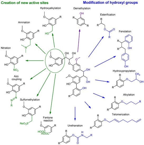 The main reactions to introducing new active sites in lignin structures are hydroxyalkylation, amination, nitration, sulphometylation, and sulphonation, whereas reactions such as azo coupling, fentone reaction, halogenation, alkylation or dealkylation, and grafting may be used for modification or as an intermediate stage in modification [25,68,79].