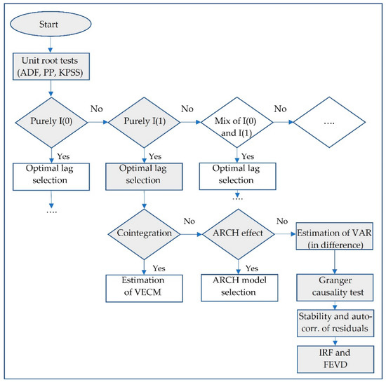 It should be noted that if the time series are cointegrated and integrated of order one, the vector error correction model (VECM) should be applied. If the order of integration of the time series is mixed, i.e., I(0) or I(1), the autoregressive distributed lag model (ARDLM) is justified. In our case, none of the abovementioned properties were observed in the datasets; therefore, the VAR(p) model was considered.