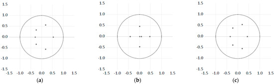 Eigenvalues of the companion matrix for: (a) model 1; (b) model 2; and (c) model 3.
