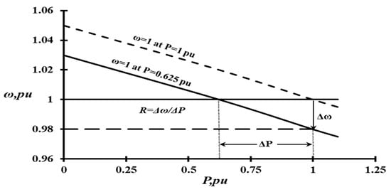 where Pg is the output power of the generator, Pref. is the standard power of the PSN and R is the speed regulator of the governor. Based on Figure 5, it can be noticed that the relationship between the turbine speed and load demand is an inverse relationship. This happens when the output power changes with regard to the size of the steam turbine, as presented in Equation (5):