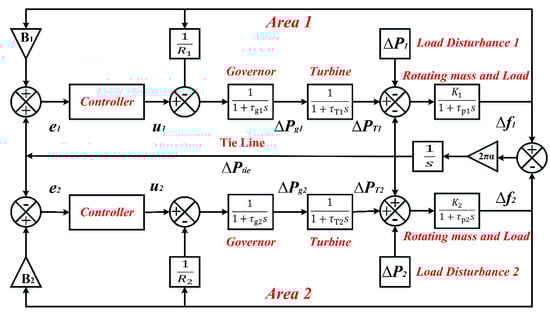 With the rapid economic development of human societies, the demand for electrical energy has increased noticeably because it has become a profitable auxiliary service in everyday lifestyles. Typically, the modern power system network (PSN) consists of many areas connected through tie lines and each area has its own generator to meet its own load with load neighbours [1,2,3]. On other side, the fluctional load demand causes an unstable frequency level in the PSN which is considered the major challenge to producing reliable electric energy for consumers [4,5,6,7,8]. The complexity of a multi-area PSN has a high effect on the power transmission line due to the non-linearities of various components of its power system. Therefore, it is quite important to design a decentred control action for individual areas [9,10,11]. A load frequency controller (LFC) is a substantial method to enhance the reliability of the PSN. This is because it maintains the frequency response level and enhances the output power delivery of the PSN when the load demand is changed rapidly by adjusting the speed governor of the generator-area PSN based on its own load demand [12,13,14]. In the early stages, the designers utilised the flywheel governor of a synchronous machine to restore the frequency level of the PSN. Unfortunately, it demonstrated an imperfect method due to the complex function of the LFC [12,15]. Next, an extra part was proposed to adjust the speed governor of the generator PSN based on several techniques. Those techniques can be classified into two branches: classical and advanced branches.