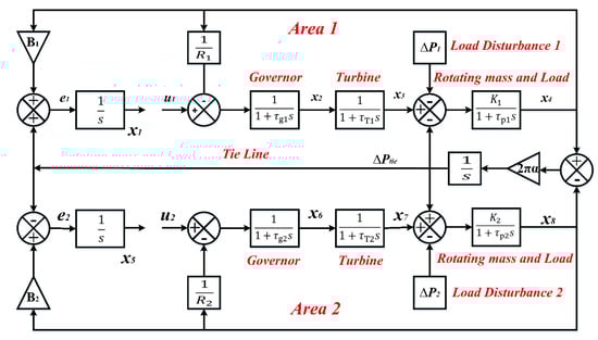 The block diagram of the two-area PSN based on the transfer function is shown in Figure 6. Then, it is utilised to derive the state space equations of the system to obtain an accurate and valid simulation test. The nomenclature of the multi-area PSN is listed in Table 2. Each area PSN consists of three blocks; governor, turbine, and load demand with its own LFC connected by a tie line. Regarding this transfer function, nine state equations are derived for a two-area interconnected power system. Equations of control input can be expressed in Equations (6) and (7):